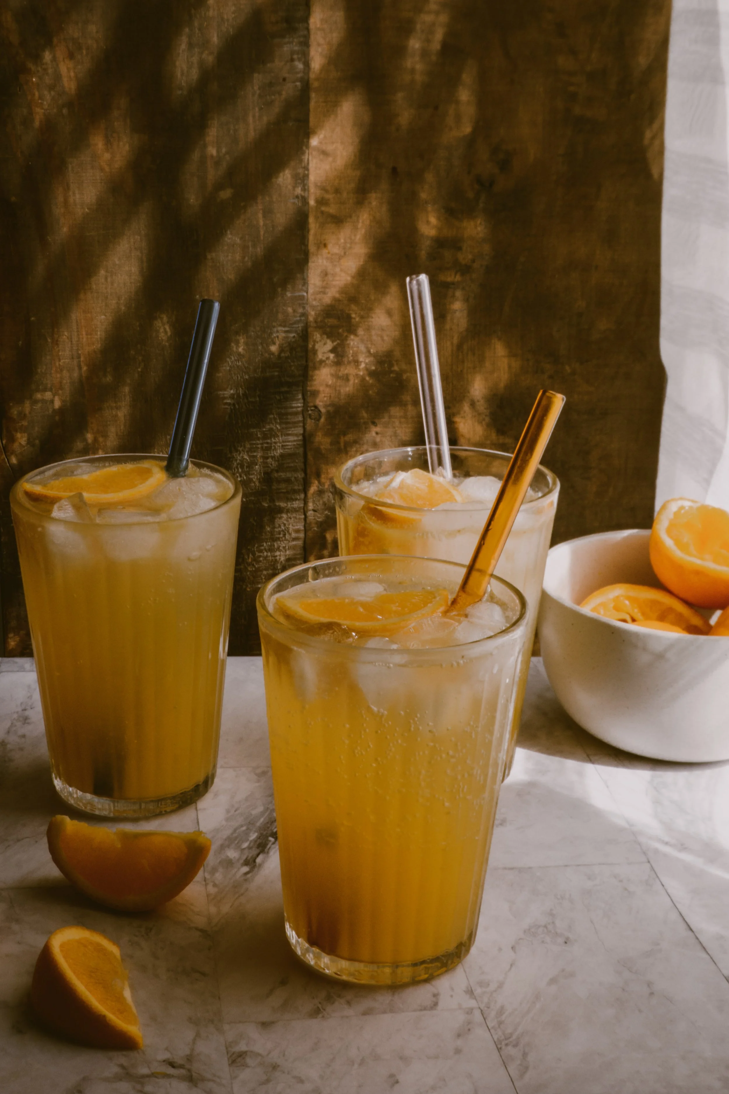 Pour servir remplir des verres de glaçons, verser 1/4 de sirop , 1/4 de jus d’orange et allonger d’eau gazeuse. Garnir de tranches d’orange.